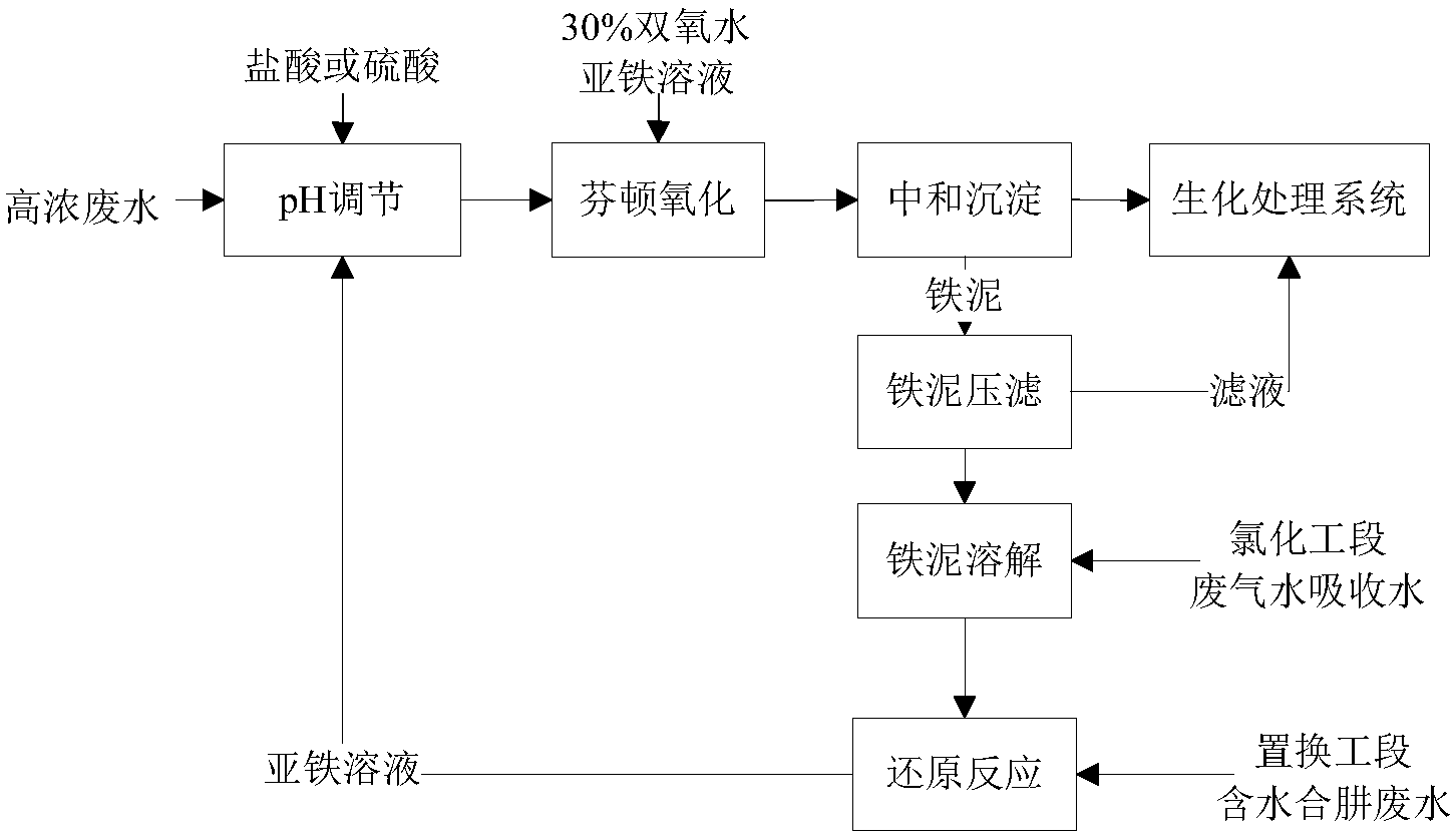 高濃度廢水經(jīng)過(guò)污水池,加入酸性原料進(jìn)行中和調(diào)解,中和后的污水加入雙氧水和亞鐵溶液,達(dá)到去除有害物質(zhì)的目的。經(jīng)過(guò)處理后的污水在經(jīng)過(guò)中和沉淀,沉淀的淤泥經(jīng)過(guò)特殊處理后外運(yùn)。具體的工藝圖如下: